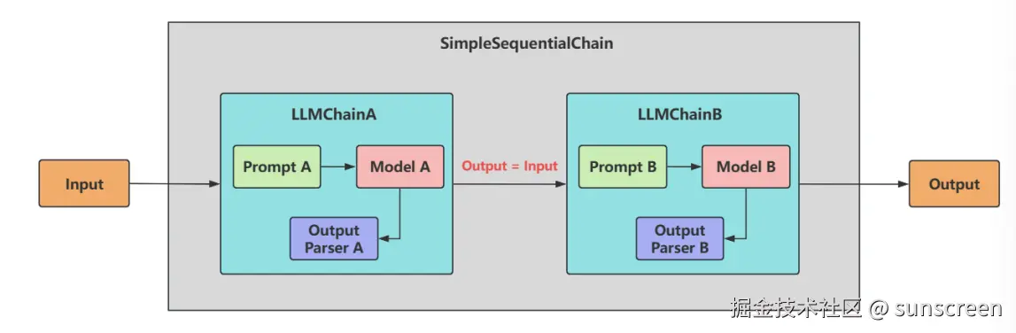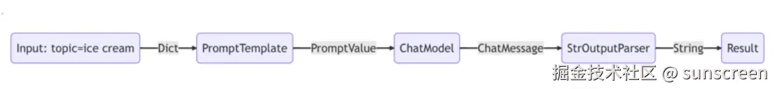 在这个链条中,用户输入被传递给提示词模板,然后提示模板的输入被传递给模型,然后模型的输出被传递给输出解析器