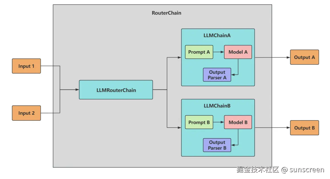 他会首先决定将要传递下去的子链,然后把输入传递给那个链。并且在设置的时候需要注意为其设置默认chain,以兼容输入内容不满足任意一项时的情况