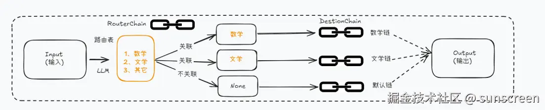 比如,我们目前有三类chain,分别对应三种学科的问题解答。我们的输入内容也是与这三种学科对应,但是随机的,比如第一次输入数学问题、第二次有可能是历史问题... 这时候期待的效果是:可以根据输入的内容是什么,自动将其应用到对应的子链中。RouterChain就为我们提供了这样一种能力。