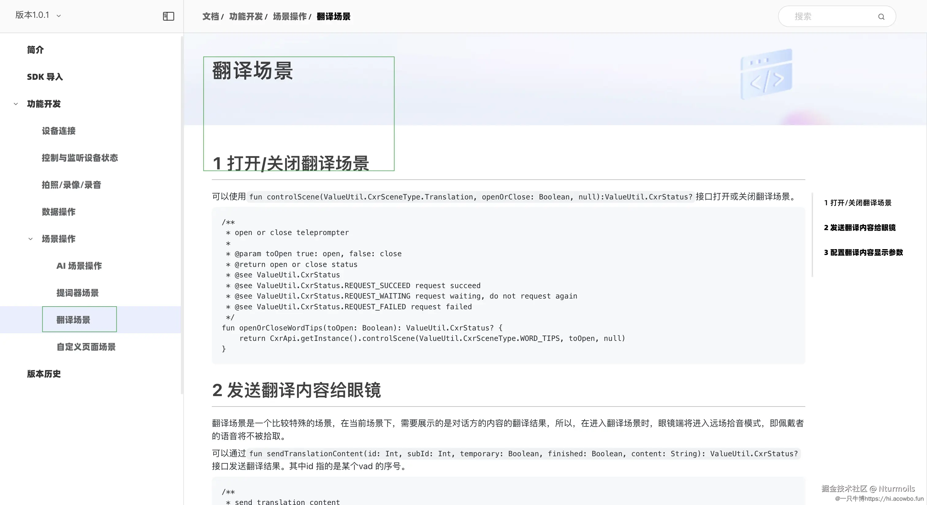 根据官方SDK文档,当前版本是V1.0.1(2025年8月25日更新),提供了9大核心功能。其中"翻译场景"正是我们实现实时翻译的关键能力。