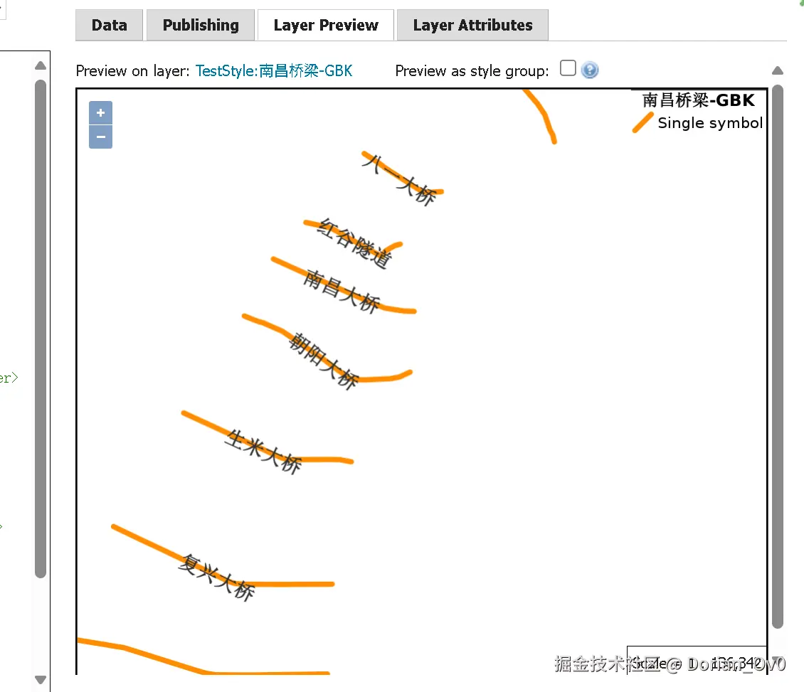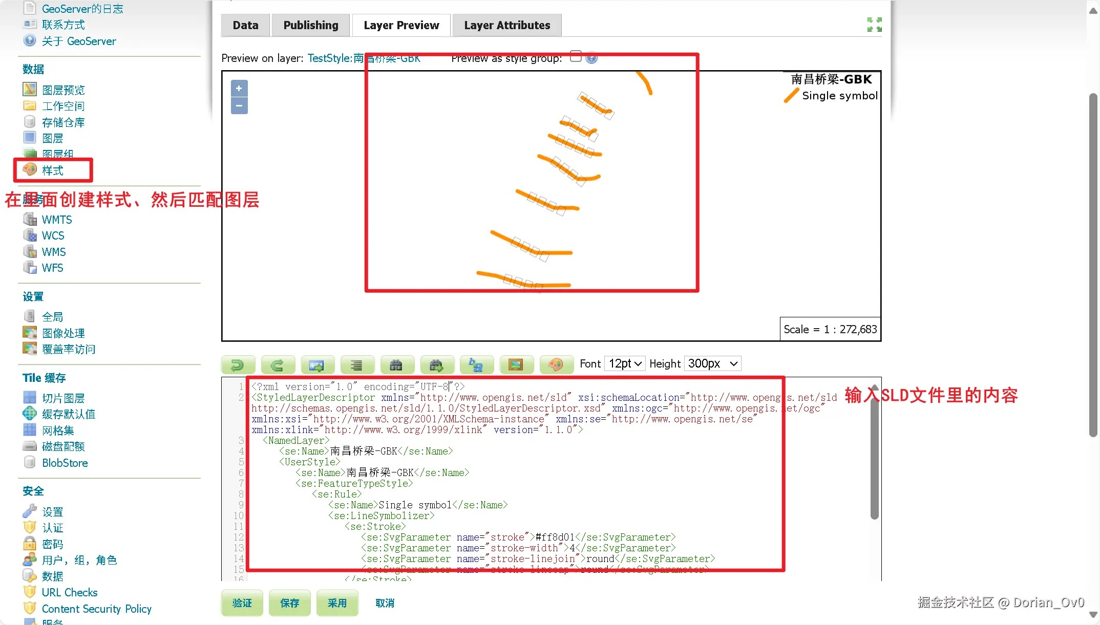 打开geoserver,新建一个样式style,匹配对应的图层,输入sld文件(或者直接导入也可以),结果如下: