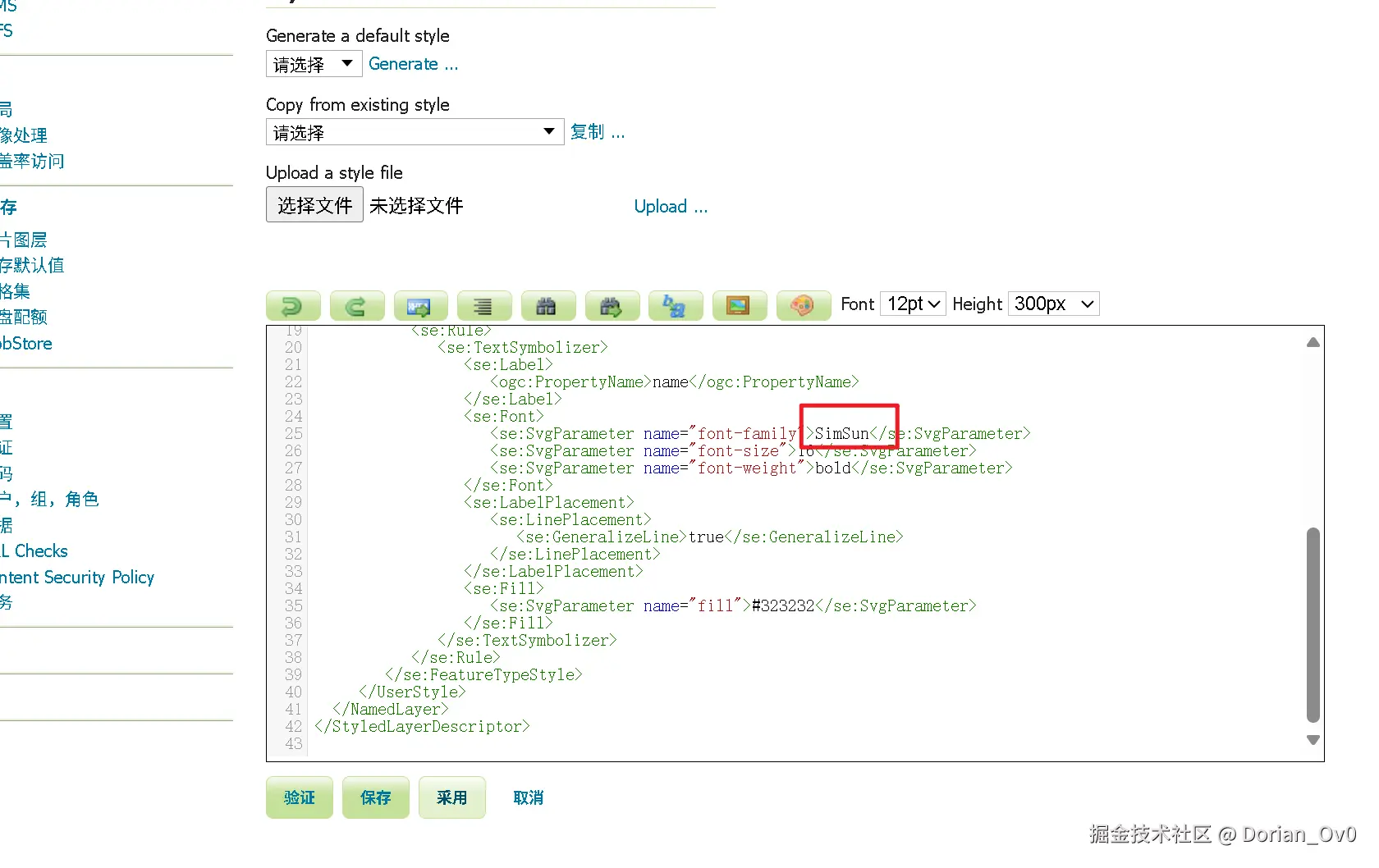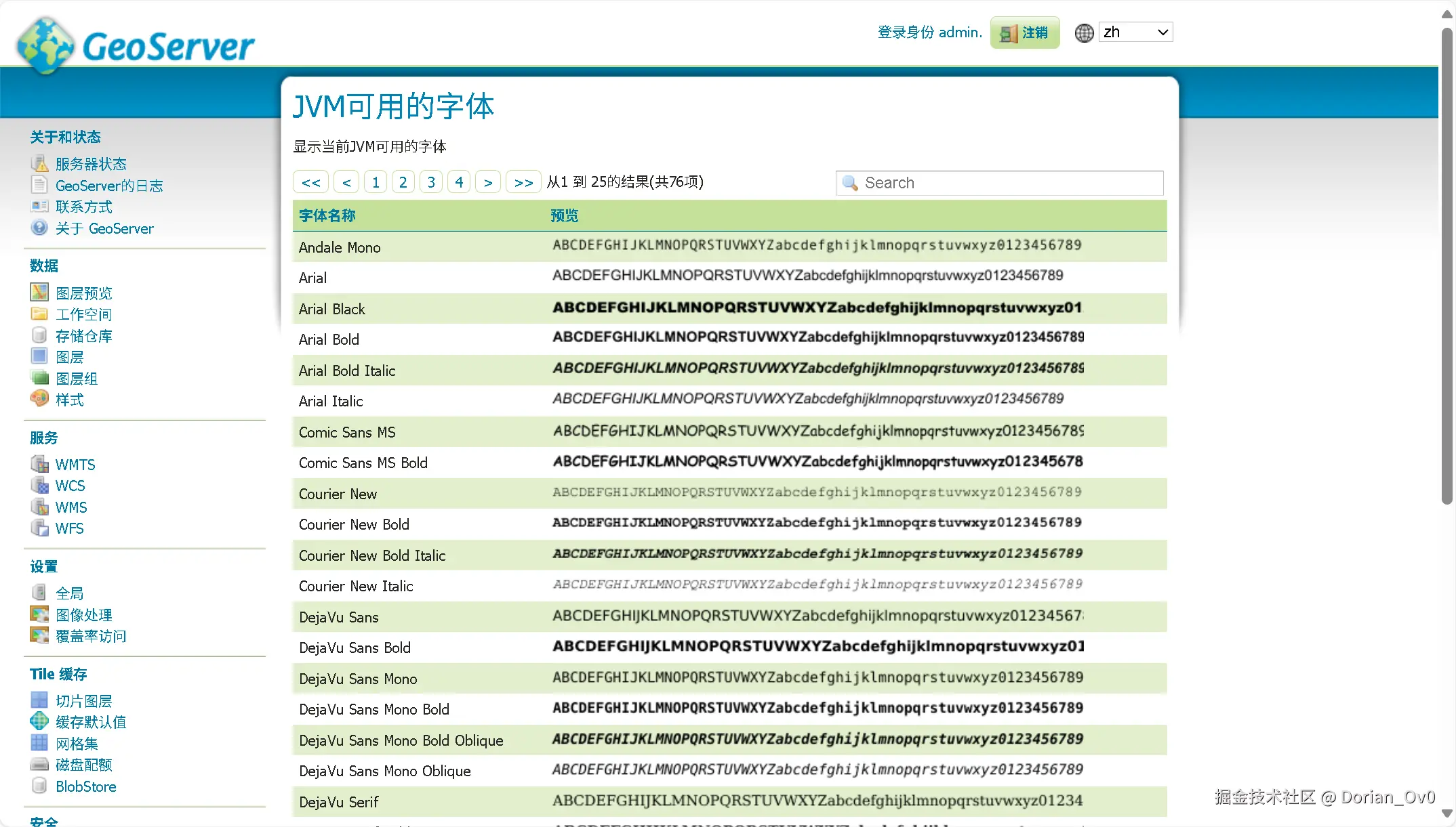 可以看到,中文注解没有显示到图层上,接下来就是本文章的重点了。 出现这个的原因是因为geoserver里可用的字体里没有兼容中文的