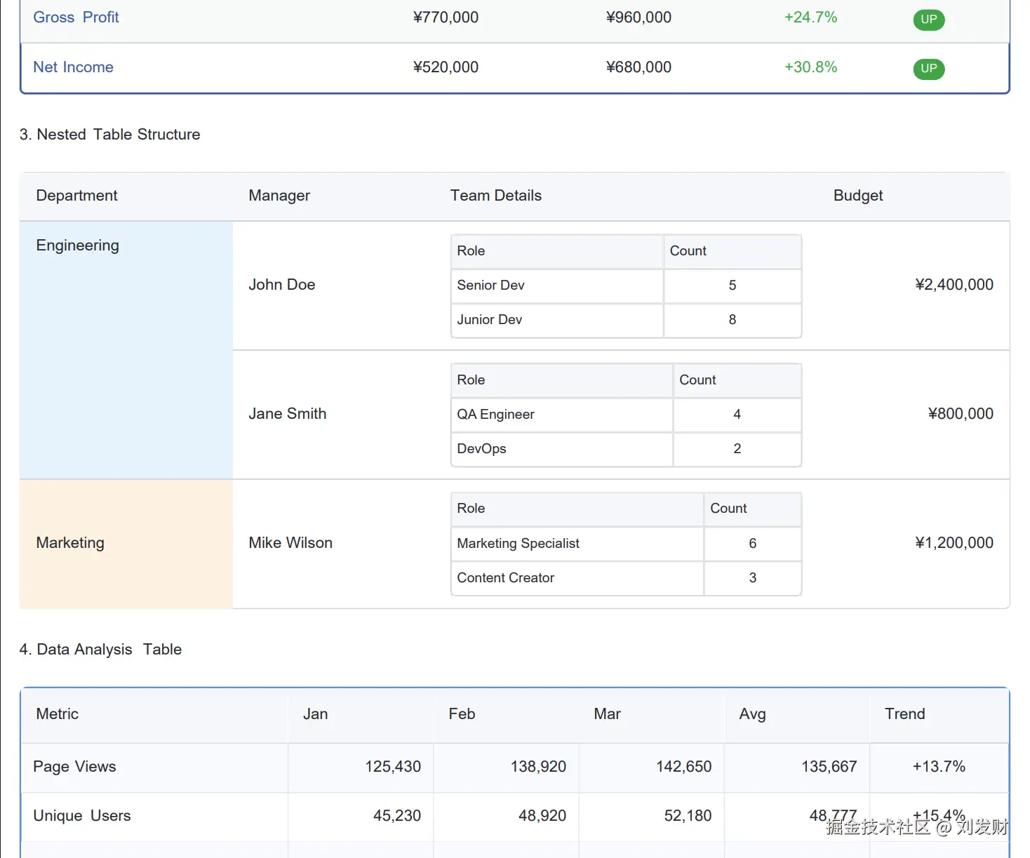 1. 文字绘制 (颜色,大小) 2. 图片绘制 (支持 jpeg, png 等格式) 3. 背景,背景颜色 (支持合并单元格) 4. 边框,复杂表格绘制 (支持合并单元格) 5. canvas (支持多种图表类型) 6. svg (支持 svg 元素绘制) 7. 阴影渲染 (使用 foreignObjectRendering,支持边框阴影渲染) 8. 渐变渲染 (使用 foreignObjectRendering,支持背景渐变渲染)