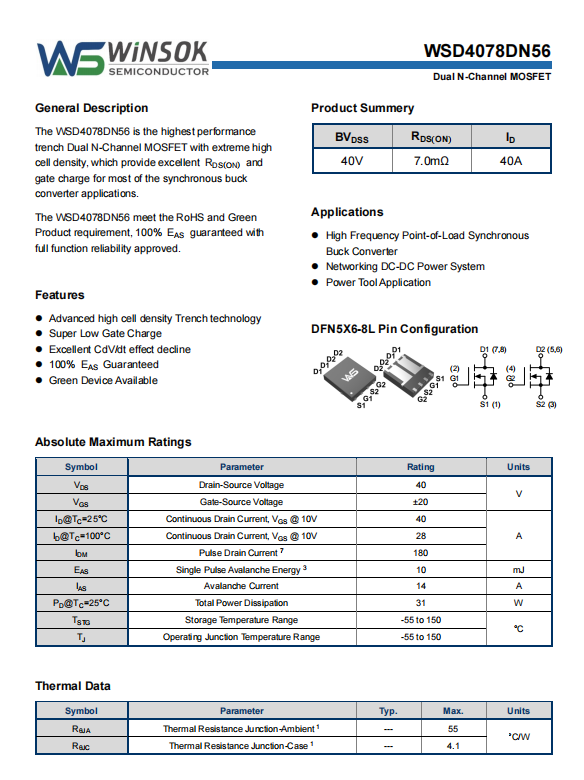 随着"移动办公"在高端车型快速普及,副驾及后排折叠桌板集成48V→20V/3A PD快充,需在6mm厚度内实现"大电流、小体积、零噪音"三重要求。微硕WINSOK推出DFN5×6-8L双N沟MOSFET WSD4078DN56,凭7mΩ极低导通电阻与40A脉冲能力,为48V桌板PD提供"芯片级"同步Buck方案,一键实现"静音+高效+超薄"。