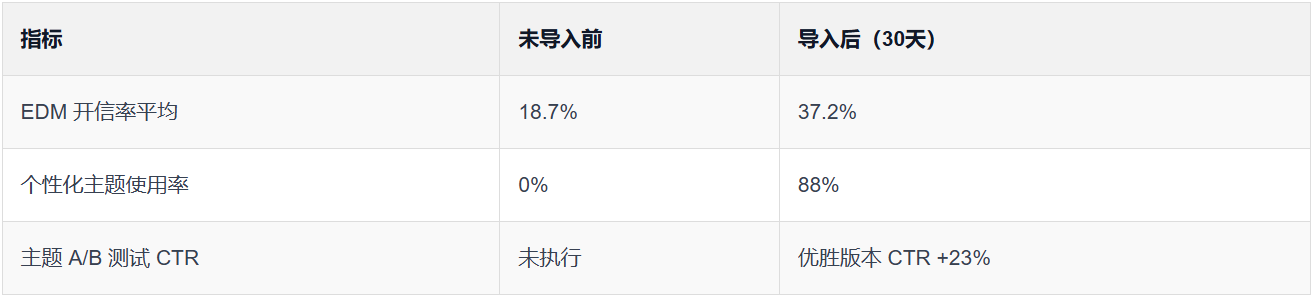 - 开信率的提升,来自主题个性化、行为分众与发送时机优化的组合;
