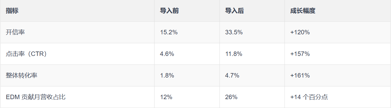 - 原挑战:EDM 到达率高但开信与转化率低,平均开信率仅 15%,每月平均转化率不到 2%
