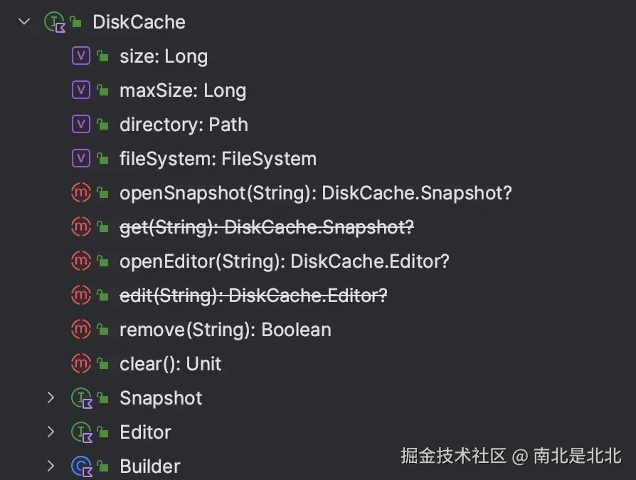 实现DiskCache的类只有一个:RealDiskCache,不过经过查看这个类只是一个代理类(提供文件缓存命名),实际实现DiskCache接口功能方法的则是:DiskLruCache