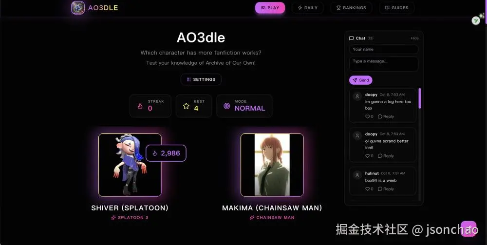 AO3dle 是一款灵感来自 Wordle 的每日猜谜游戏,玩家需要根据各种线索猜出 Archive of Our Own ( AO3 )上的神秘同人文作品。游戏中会展示两个来自动漫、游戏或流行文化的角色,玩家需要猜测哪个角色在互联网上拥有更高的人气值,猜对即可继续连胜。