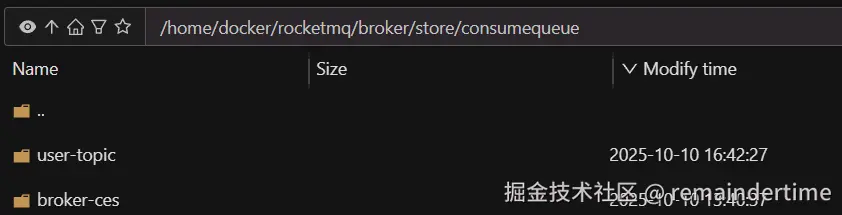 进入服务器 broker master 的/home/docker/rocketmq/broker/store/consumequeue