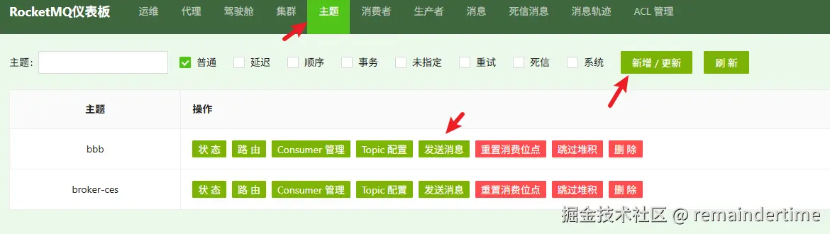 - RocketMQ Dashboard:可视化管理控制台,用于查看消息、监控集群运行状态及管理 Topic、消费组等。