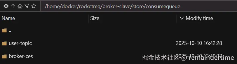 进入服务器 broker slave 的/home/docker/rocketmq/broker-slave/store/consumequeue