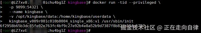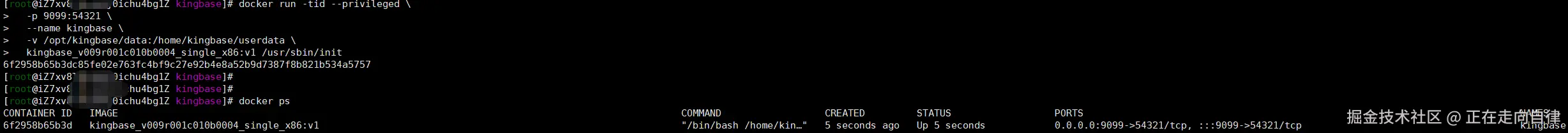 6f2958b65b3d kingbase_v009r001c010b0004_single_x86:v1 "/bin/bash /home/kin..." 5 seconds ago Up 5 seconds 0.0.0.0:9099->54321/tcp, :::9099->54321/tcp kingbase