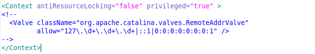 要允许远程访问控制台,到webapps/manager/META-INF/context.xml(Host Manager到webapps/host-manager/META-INF/context.xml修改)将如下内容注释掉(合作和追加IP地址也可以):