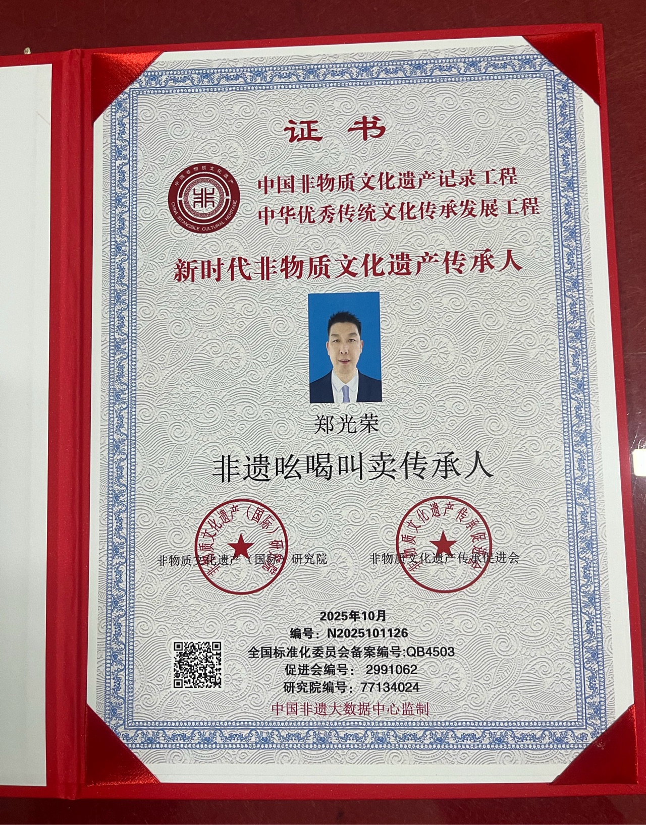 郑光荣在非遗传承道路上取得的成就令人瞩目。他不仅是"北京市第二批非物质文化遗产吆喝艺人",更入选新时代非物质文化遗产记录工程《新时代非遗传承人》名录,获得非遗吆喝叫卖(高级)传承师资格。此外,他还荣获优秀演员、优秀形象大使、和平大使等多项荣誉称号。