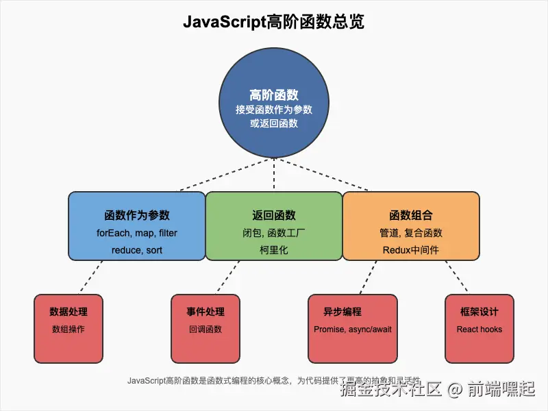 下面这张图展示了JavaScript高阶函数的核心概念和应用场景: