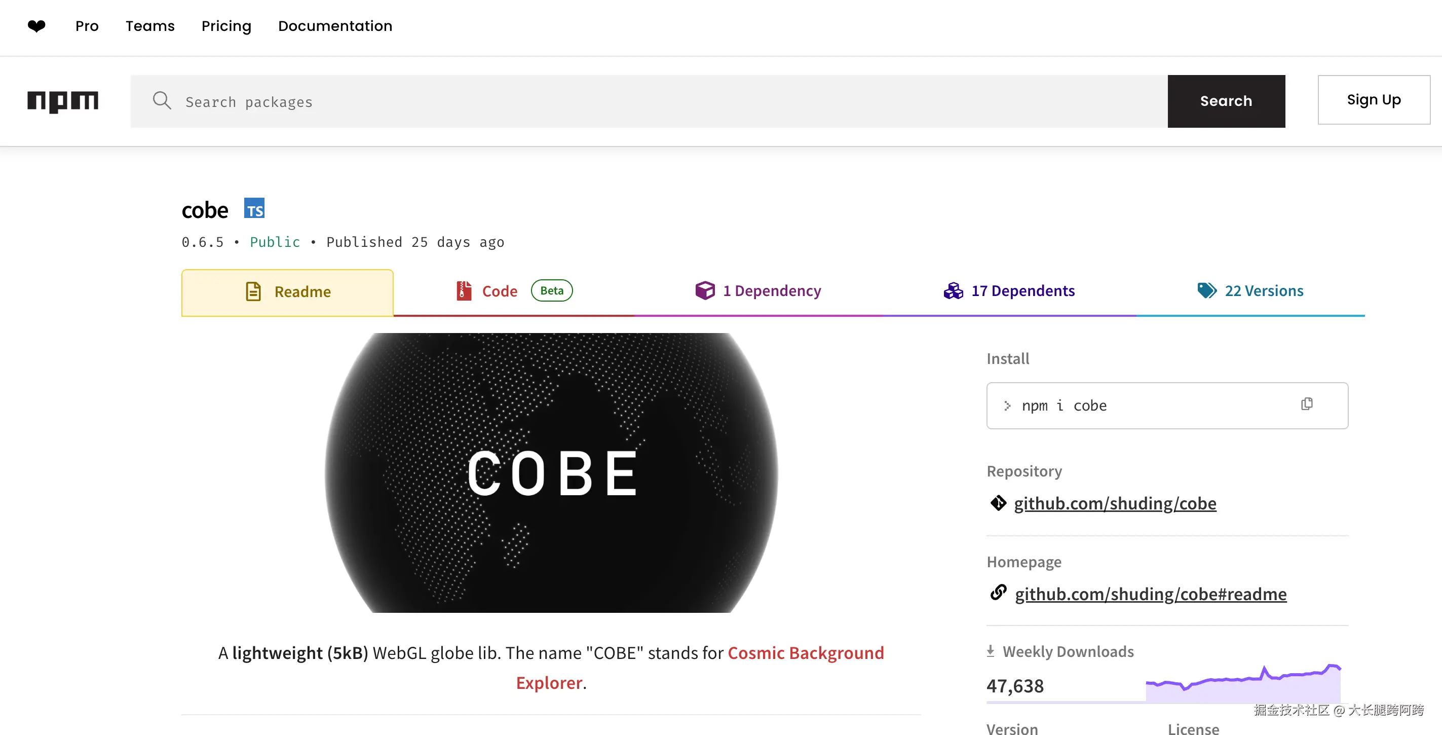 下面是我安装的版本 "cobe": "^0.6.5" 注意我的项目是SSR,这个库esm格式的,所以需要在浏览器环境运行 这点要注意
