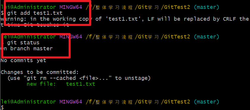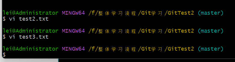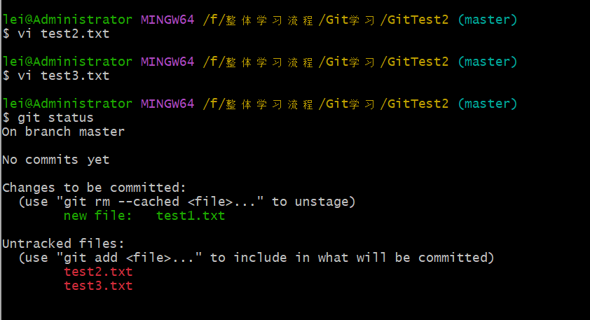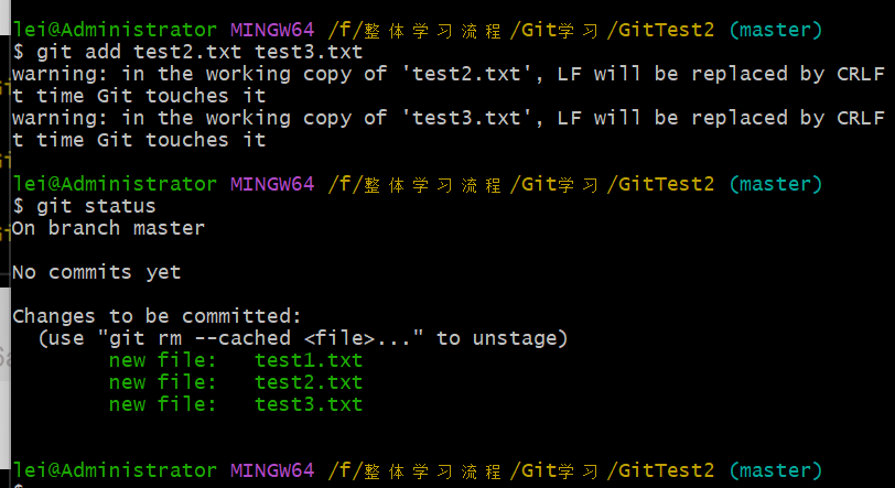 如果要提交多个文件,我们可以在add后面指定文件的列表,git add test2.txt test3.txt