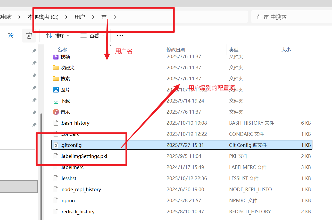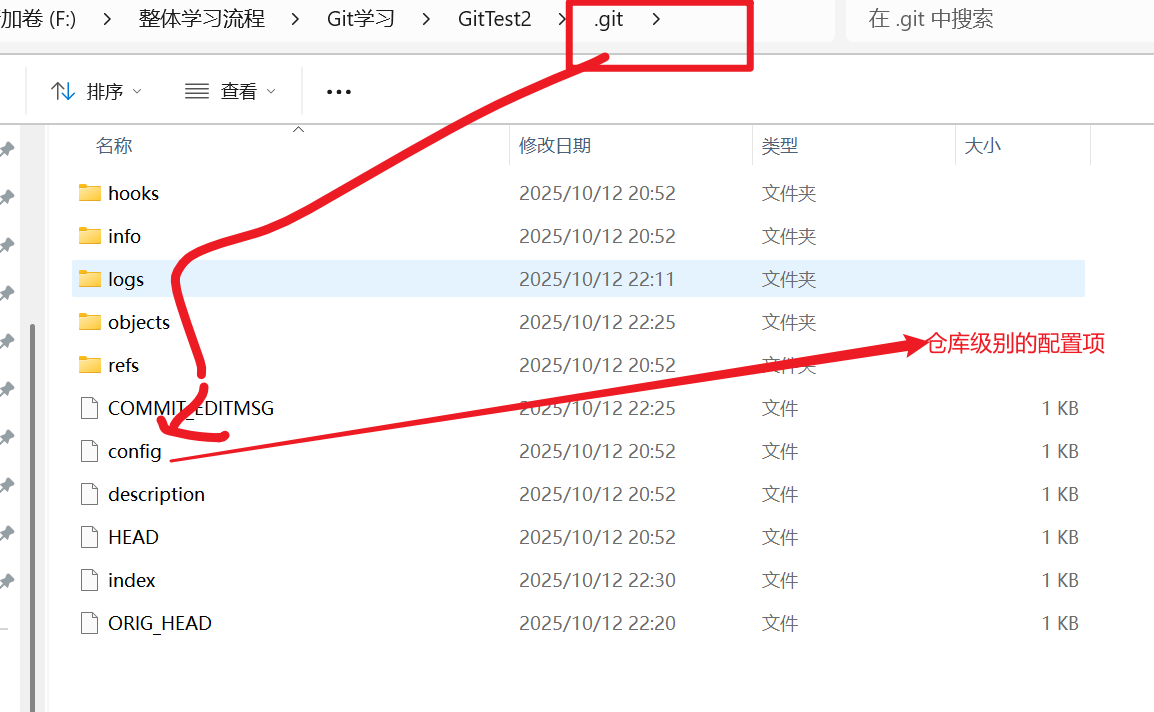 git 仓库级别对应的配置文件是当前仓库下的.git/config