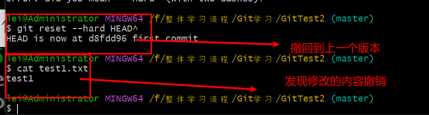 现在我想使用版本回退操作,我想把当前的版本回退到上一个版本,要使用什么命令呢?可以使用如下2种命令,第一种是:git reset --hard HEAD^