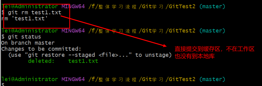 我们发现删除的文件直接进入暂存区(此刻需要注意,如果使用rm删除不在暂存区,需要git add