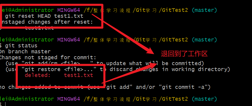 才会进入暂存区。如果进入暂存区可以退回工作区,使用下面命令 git reset HEAD test.txt