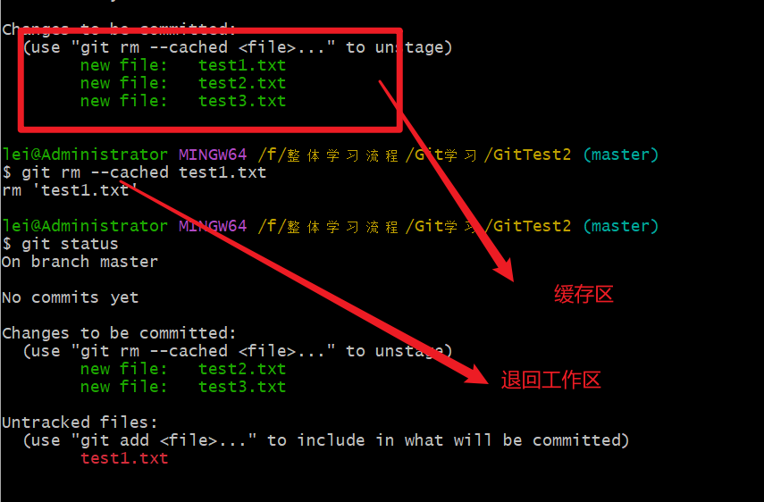 我们可以通过提示的话来撤销回工作区 git rm --cached readme.txt