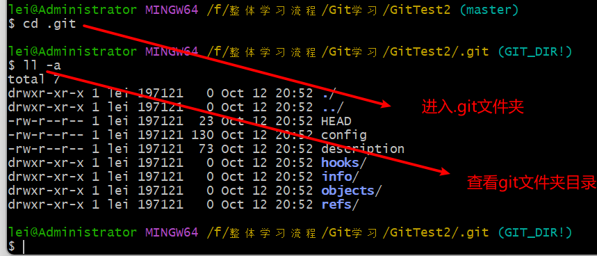 这时候你当前GitTest2目录下会多了一个.git的目录,这个目录是Git来跟踪管理版本的,没事千万不要手动乱改这个目录里面的文件 ,否则,会把git仓库给破坏了。.git里面内容如下: