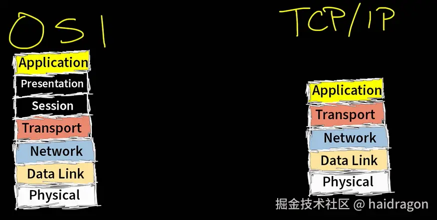 TCP/IP 与 OSI 模型的对比图(来源:下方 YouTube 视频)