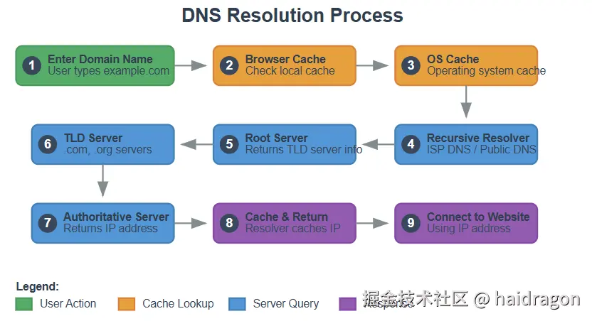 我在面试时被问过 DNS 查询流程,结果忘了"浏览器和操作系统缓存"那部分 🥲。 建议记住完整流程。想深入了解可看 Cloudflare 的解释。