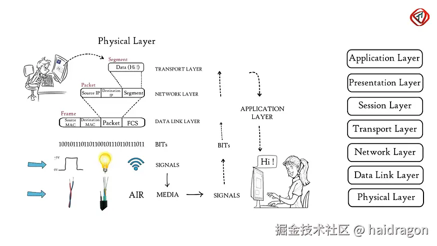 到目前为止,我们看到的都是 1 和 0。 在物理层中,这些二进制数据会被转换成电信号,通过电缆、光纤或空气传输到目标设备。 接收方再反向还原这些信号,你才能在电脑上看到这篇博客。