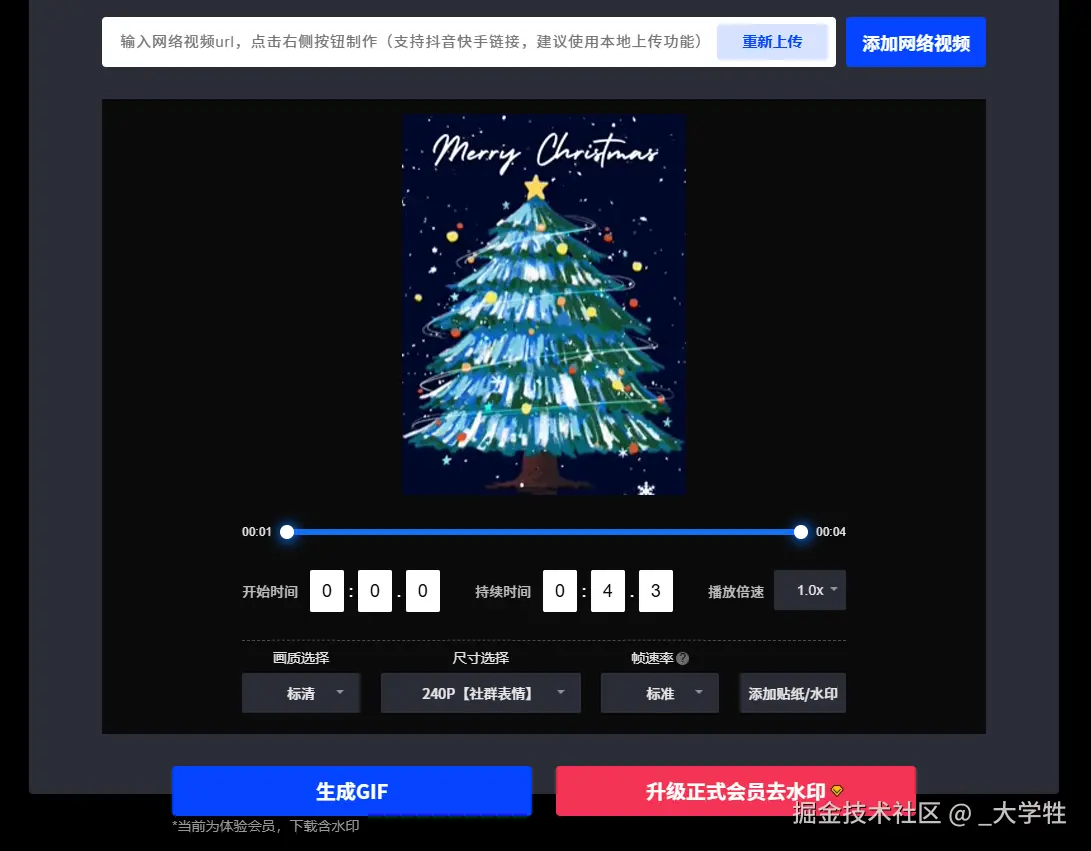 处理视频帧生成 GIF 文件流。- 最后,用户可以 预览生成效果 ,满意后直接进行 拖曳上传 或一键下载 无水印 GIF。