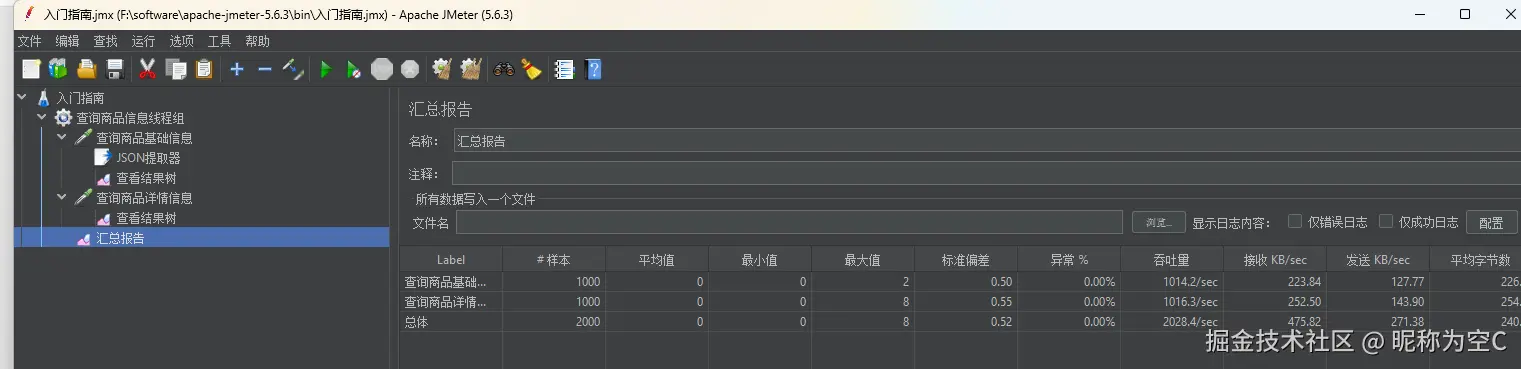 - 汇总报告 可以添加到取样器下也可以添加到线程组下面查询总体情况