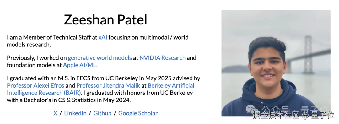 其中,Zeeshan Patel 今年 5 月硕士毕业于 UC 伯克利,研究主要面向深度学习、生成模型和物理人工智能。