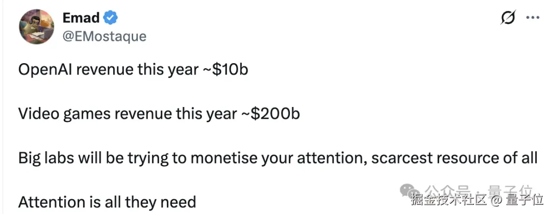 OpenAI 今年收入约 100 亿美元,视频游戏行业今年收入约 2000 亿美元。
