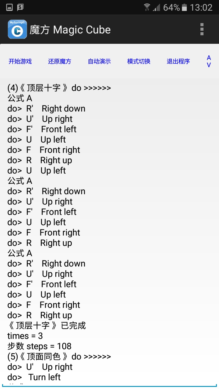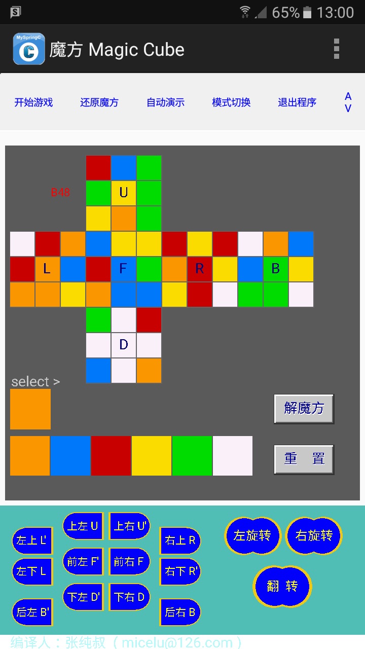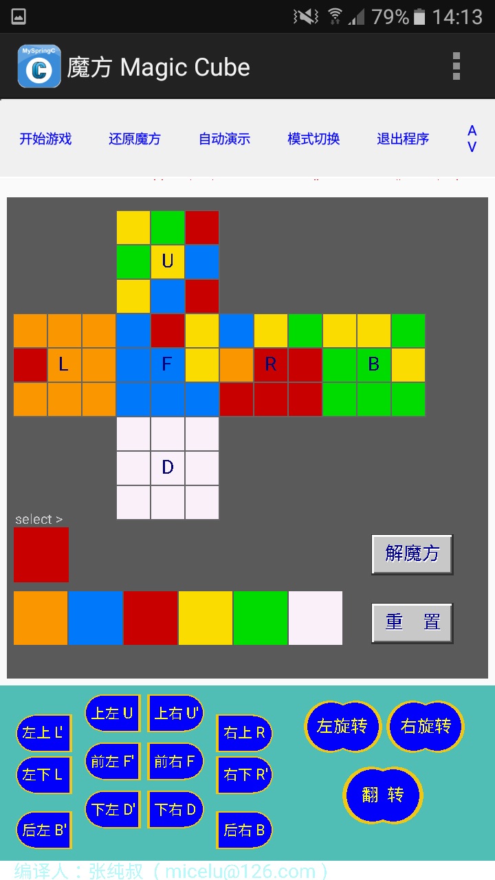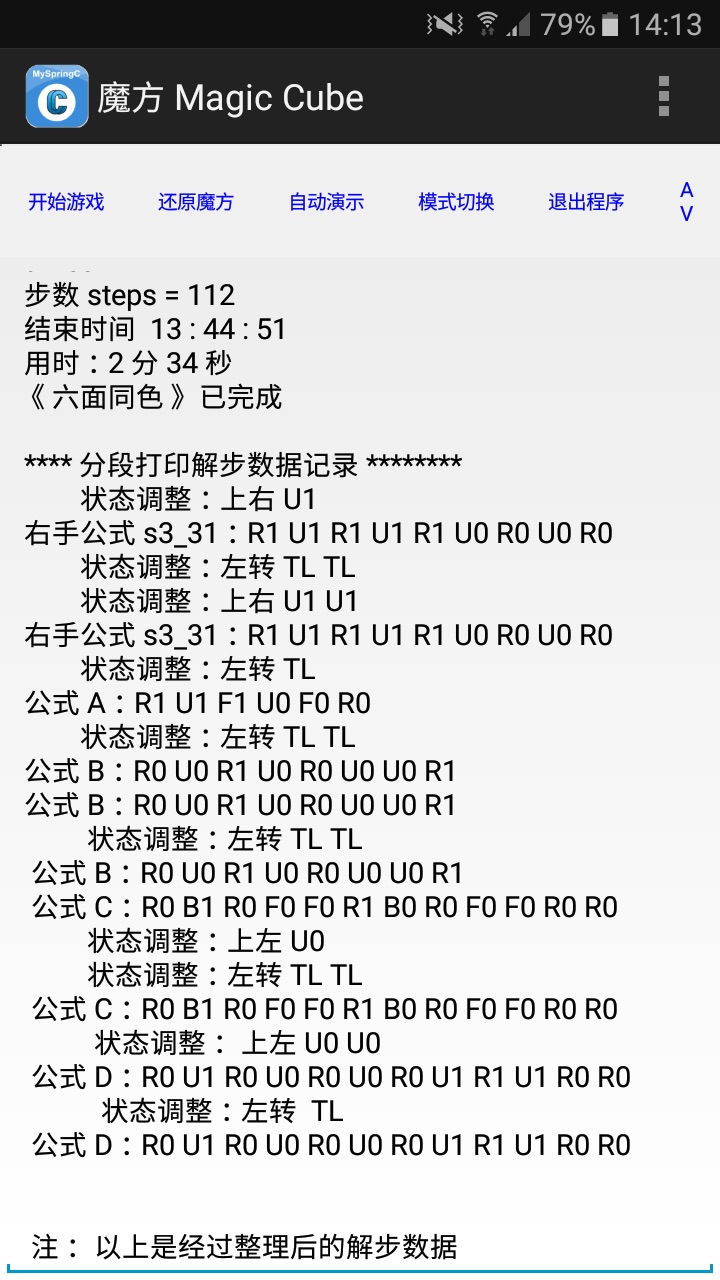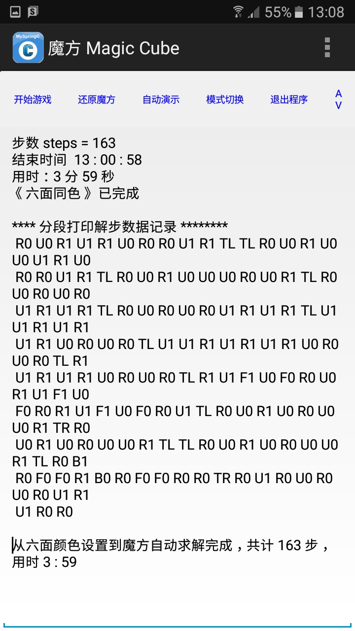 求解模式:设置魔方六个面的颜色输入界面,按实际的魔方各个块的颜色点击输入到颜色设置板即可自动求解魔方。游戏程序有详细的操作步骤记录。另有用于输出的操作步数据。