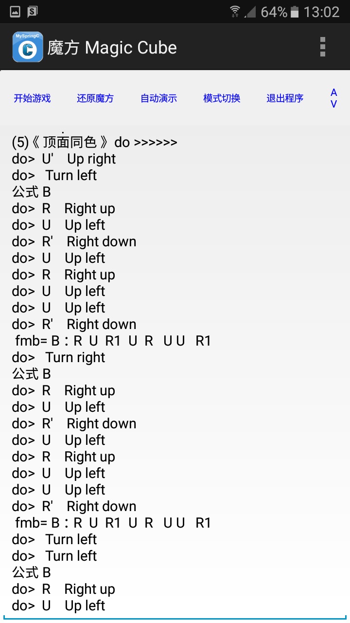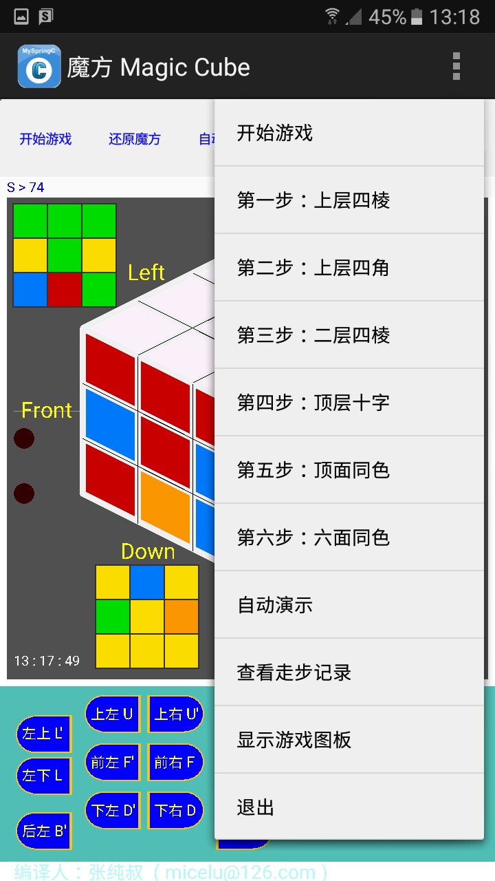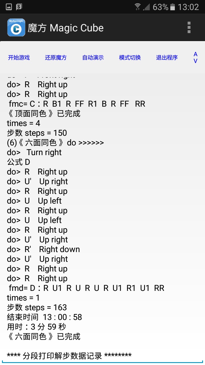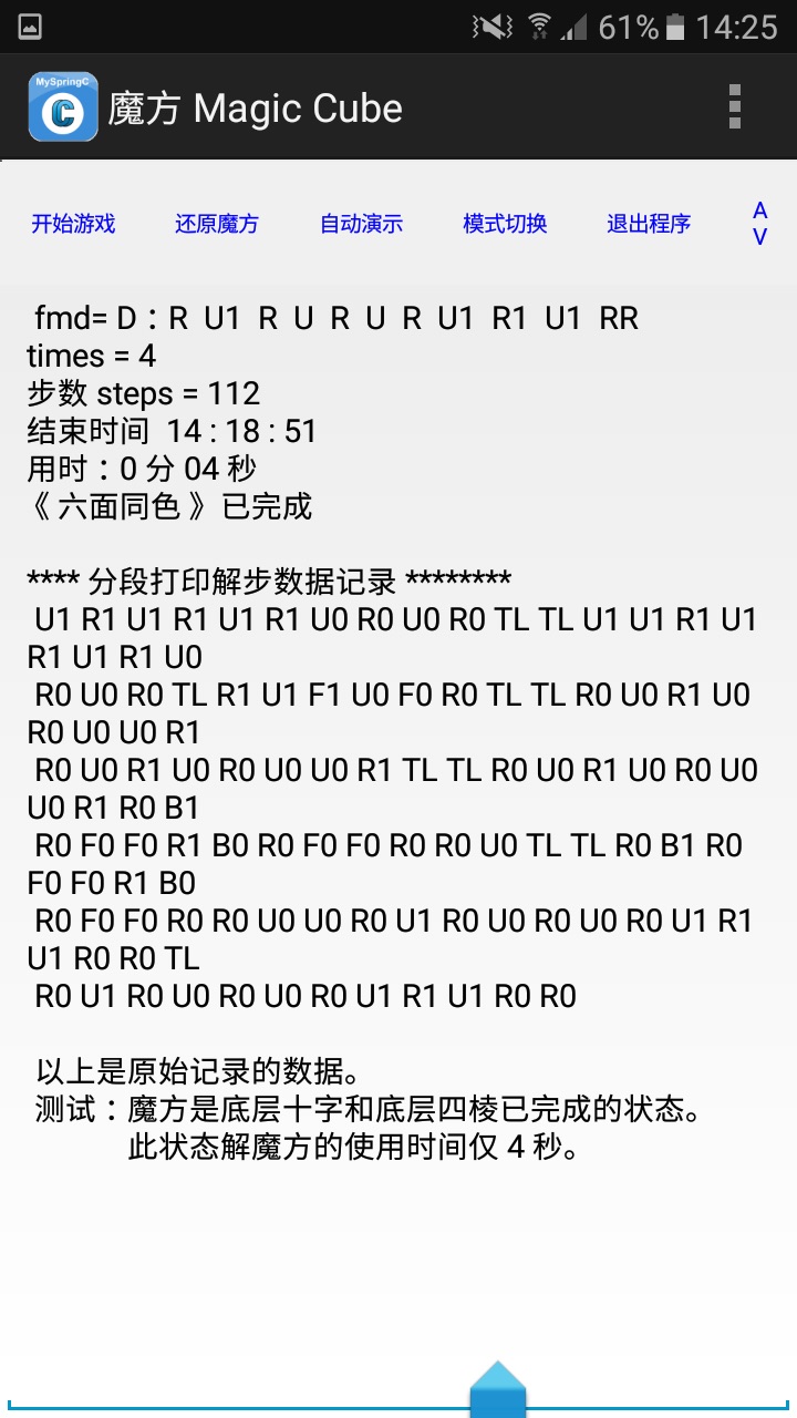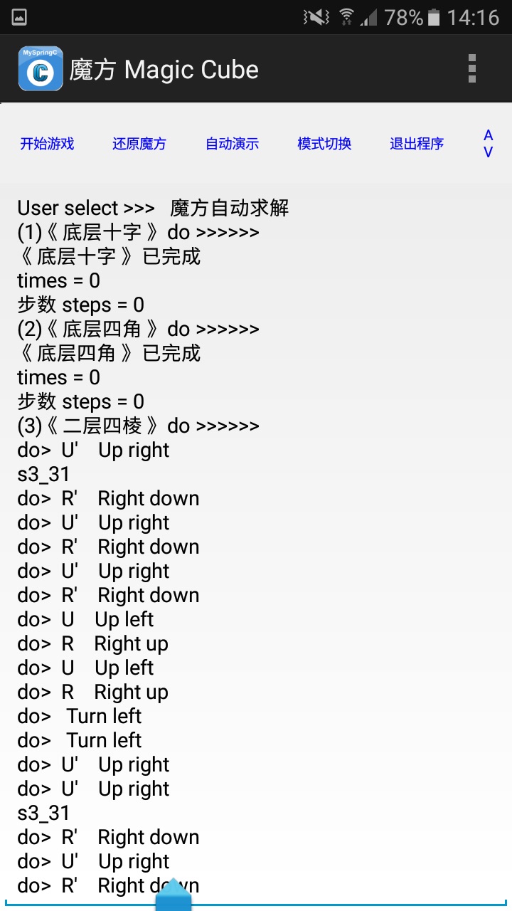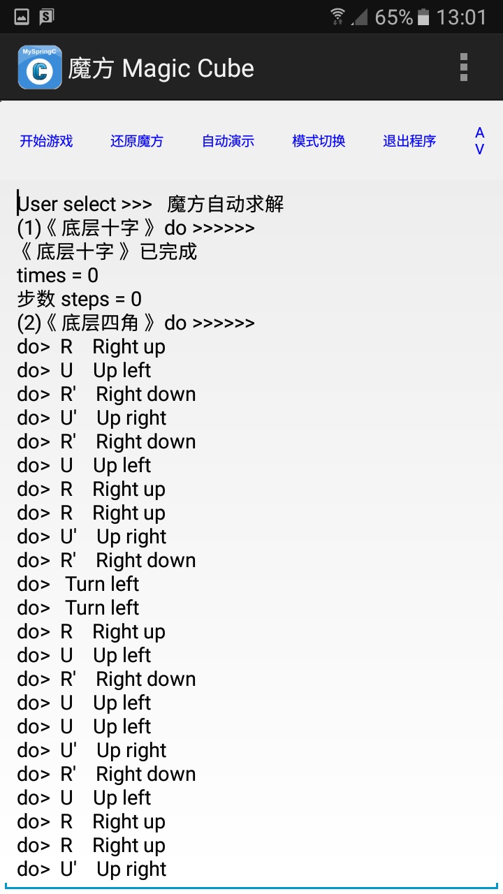 求解模式:设置魔方六个面的颜色输入界面,按实际的魔方各个块的颜色点击输入到颜色设置板即可自动求解魔方。游戏程序有详细的操作步骤记录。另有用于输出的操作步数据。