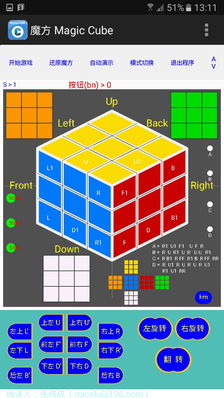 另加了层先法的第一步底层十字和第二步底层棱角的隐式操作按钮(step1 , step2),以及第三步上层十字到第六步六面同色的四个公式(A B C D )的隐式操作按钮。