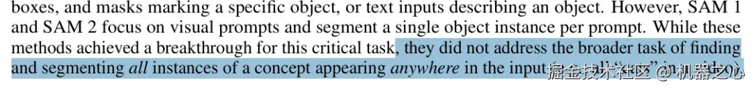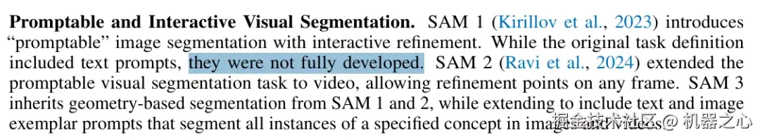 论文中明确指出,在 SAM 1 中,文本提示的功能「没有被完全开发」(were not fully developed)。SAM 1 和 SAM 2 的实际重点在于视觉提示(如点、框、掩码)。