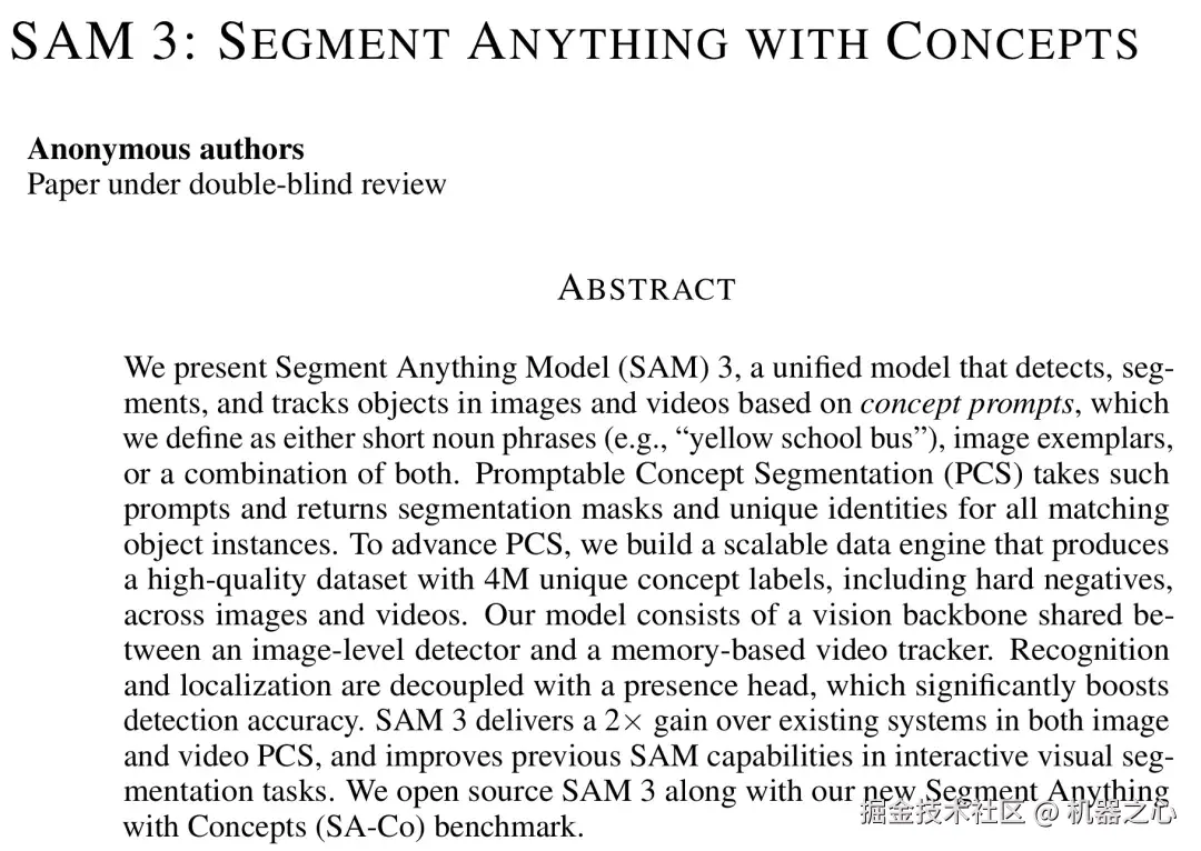 9 月 12 日,一篇匿名论文「SAM 3: SEGMENT ANYTHING WITH CONCEPTS」登陆 ICLR 2026,引发网友广泛关注。
