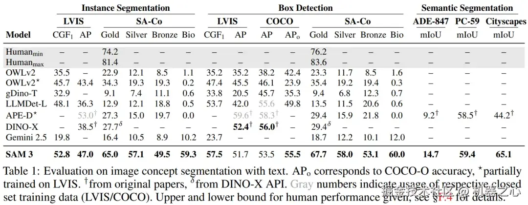 表 1 显示:在零样本设置下,SAM 3 在封闭词汇数据集 COCO、COCO-O 和 LVIS 的边界框检测任务中具有竞争力,在 LVIS 掩码任务上表现显著更好。