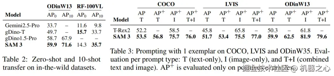 带有 1 个样本的 PCS。表 3 显示在三种设置下,SAM 3 在 COCO (+17.2)、LVIS (+9.7) 和 ODinW (+20.1) 上的表现均远超之前最先进的 T-Rex2。