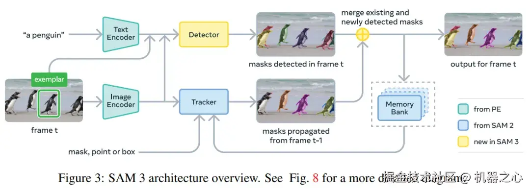 在模型架构上,SAM 3 采用双编码器 - 解码器 Transformer 架构,这是一个具有图像级识别能力的检测器 ------ 通过与跟踪器和内存模块相结合,可应用于视频领域。检测器和跟踪器通过对齐的感知编码器(PE)主干网络接收视觉 - 语言输入。