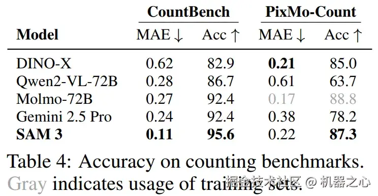 物体计数。结果如表 4 所示,与 MLLM 相比,SAM 3 不仅实现了良好的物体计数准确率,而且还提供了大多数 MLLM 无法提供的对象分割功能。