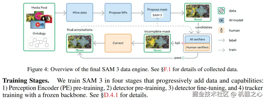 此外,该研究还构建了一个可扩展的人机协同数据引擎(如下图),用于为大规模多样化训练数据集进行标注。基于这套系统,该研究成功标注了包含 400 万独特短语和 5200 万掩码的高质量训练数据,以及包含 3800 万短语和 14 亿掩码的合成数据集。