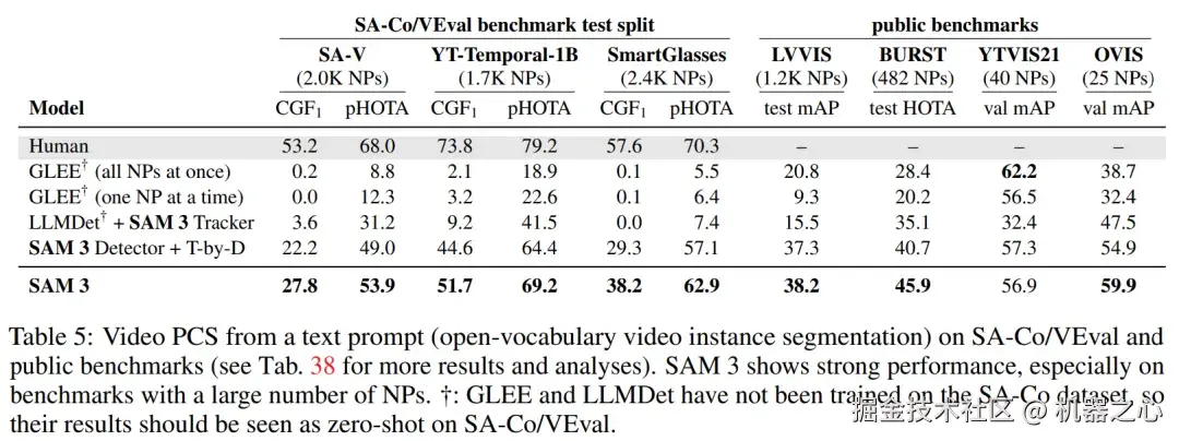 SAM 3 在文本提示下的视频分割表现。结果显示 SAM 3 的表现远超基线,尤其是在包含大量名词短语的基准测试中。