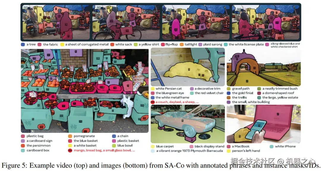 即将文本和 / 或图像范例作为输入,为每一个与该概念匹配的对象预测实例掩码和语义掩码,同时在视频帧之间保持对象身份的一致性。该工作的重点是识别原子视觉概念 (atomic visual concepts),因此将输入文本限制为简单的名词短语,例如「红苹果」或「条纹猫」,只要描述你想要的东西,它就能在图像或视频中找到并分割出每一个对应实例。