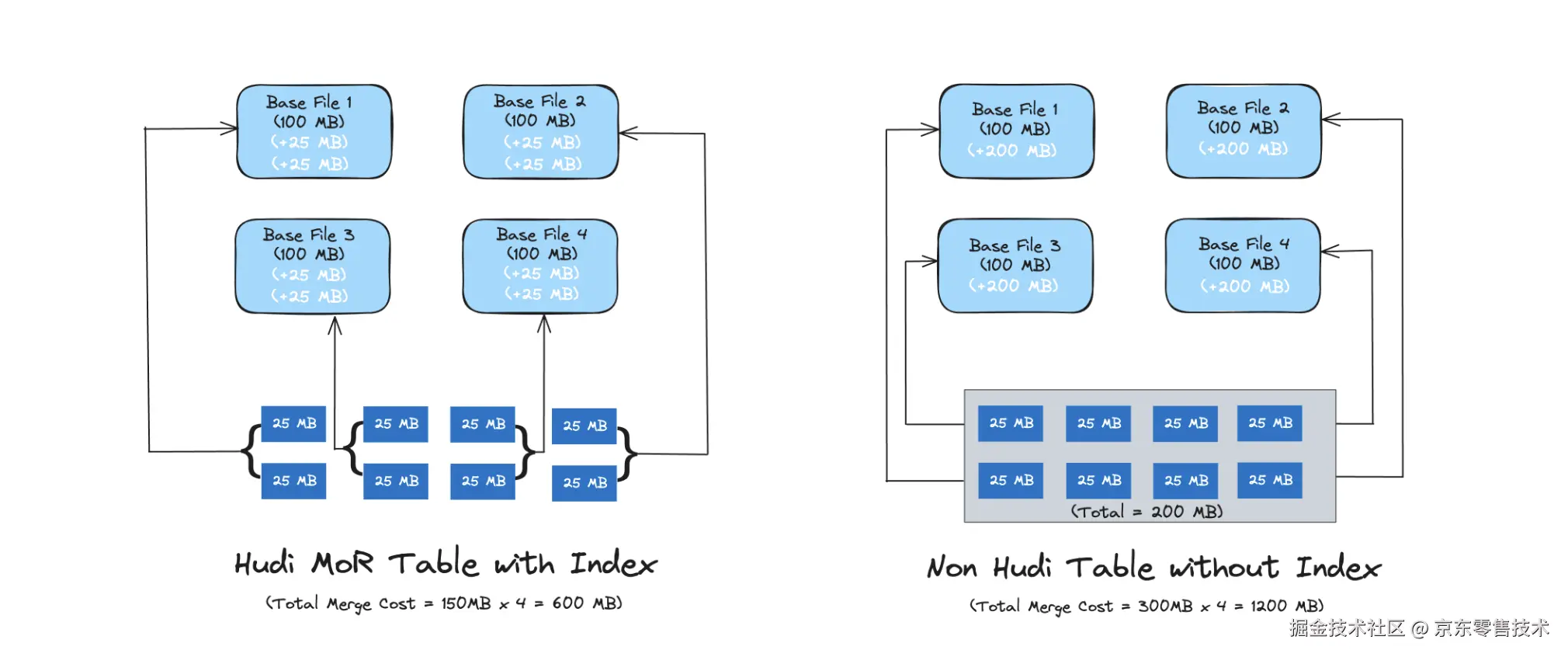 对于 Copy-On-Write表,索引可实现快速的插入/删除操作,因为无需与整个数据集连接来确定要重写哪些文件。对于Merge-On-Read 表,索引允许 Hudi 限制需要合并任何给定基础文件的更改记录数量。具体而言,给定基础文件仅需与属于该基础文件的记录的更新合并。相反,没有索引组件的Hive ACID需要将所有的基本文件与所有传入的更新/删除记录合并。