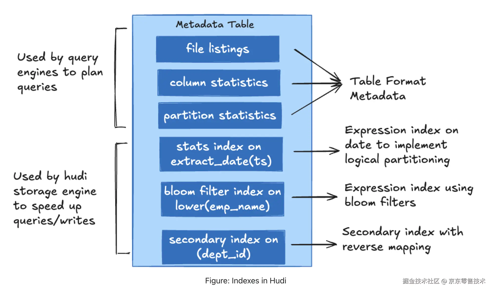 Hudi 通过增强元数据表以合并新类型索引的能力来支持多模式索引,并辅以索引构建的异步机制。此增强功能支持元数据表中的一系列索引,从而显著提高了写入和读取表的效率。