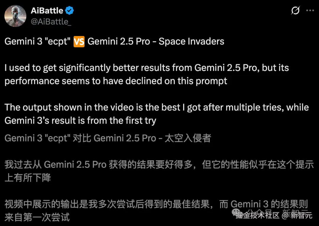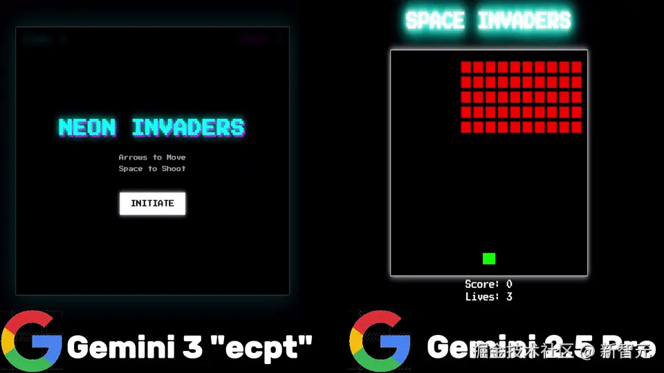 网友还将同一个提示扔给 Gemini 2.5 Pro 和 Gemini 3.0,后者一次尝试就完成了「太空侵略者」的游戏。
