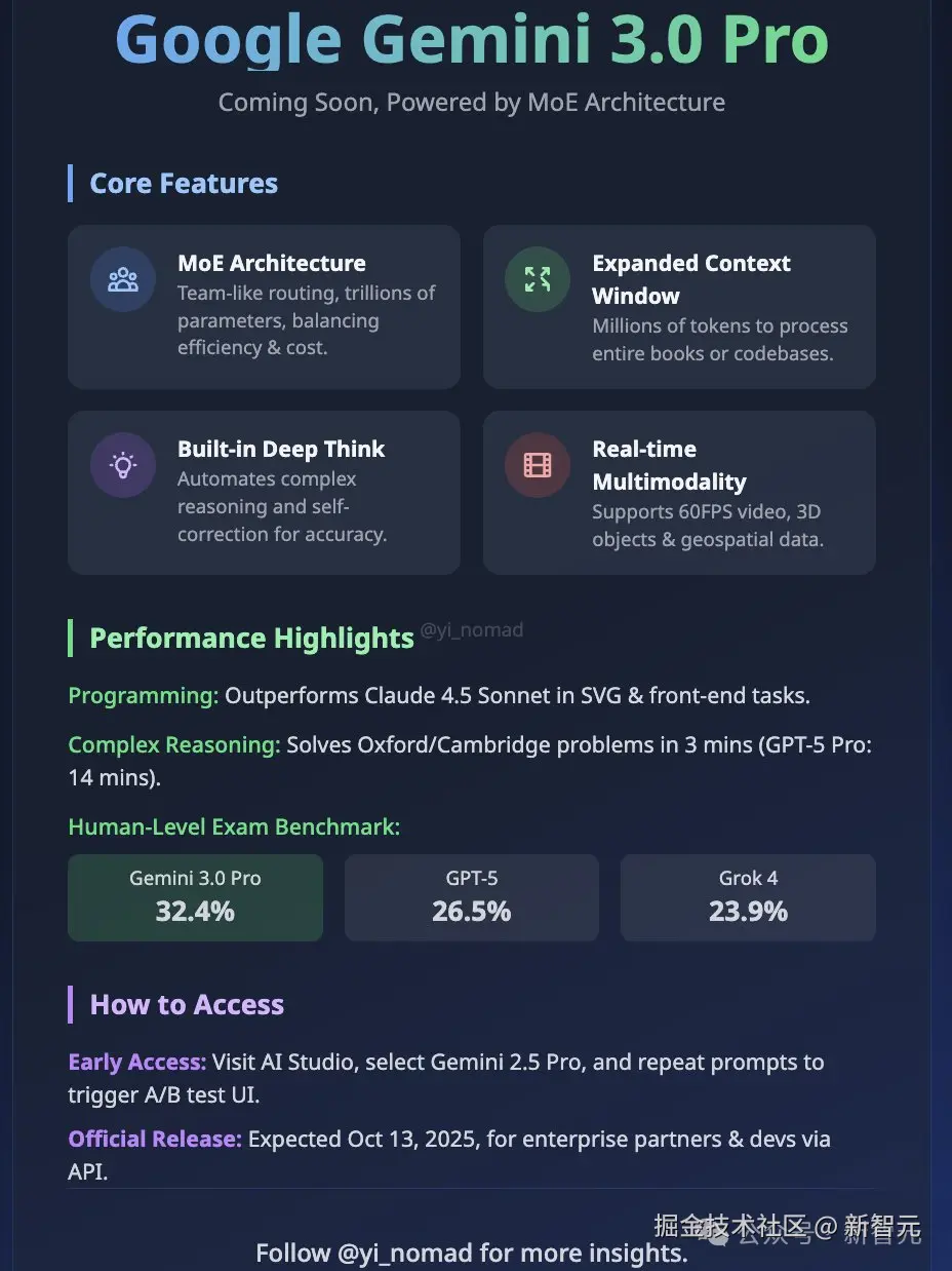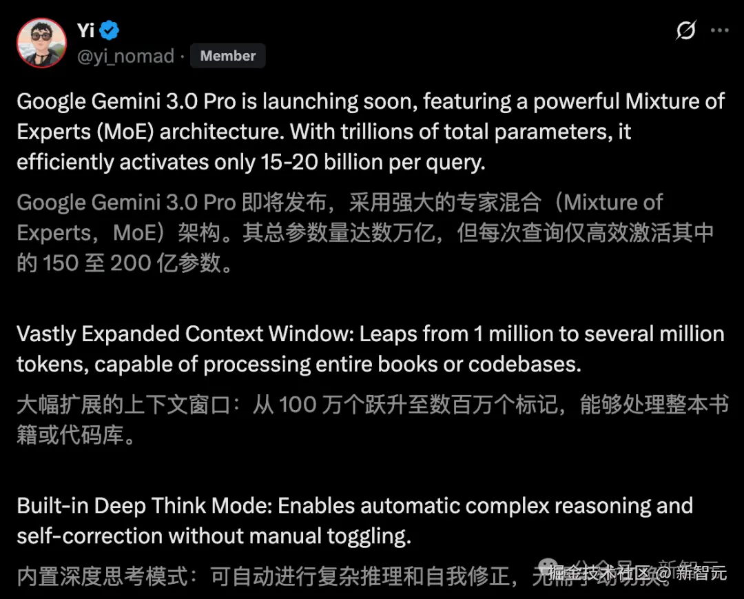 关于模型更多爆料,Gemini 3.0 同样采用了 MoE 架构,超万亿参数,每次查询激活参数为 150-200 亿参数。